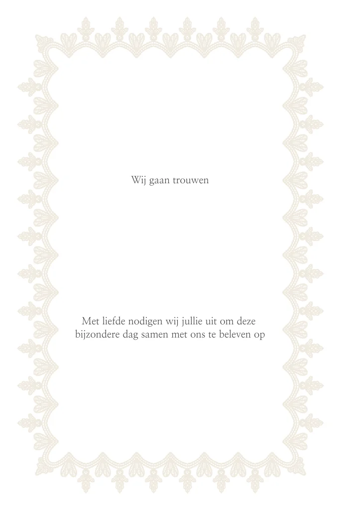 Maak een mooie chique trouwkaart om familie en vrienden jullie trouwdatum bekend te maken. Dit is een klassieke trouwkaart met een kader in beige en teksten in goudfolie. De teksten in goudfolie worden als glimmend laagje op kaart gedrukt. Voeg aan de achterkant informatie toe over jullie trouwdag.
