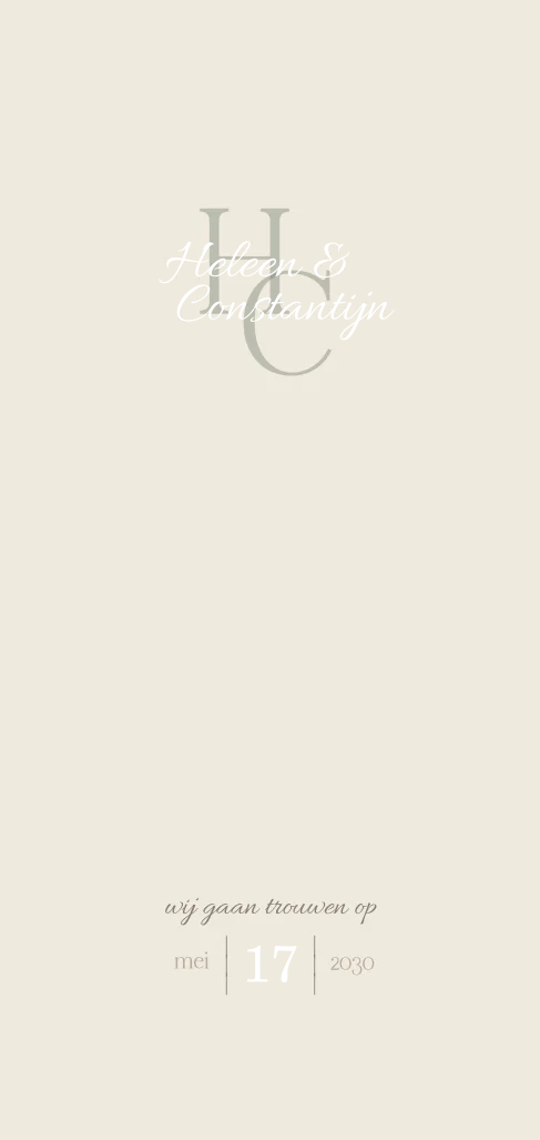 Bestel een klassieke trouwkaart om vrienden en familie uit te nodigen voor jullie trouwdag. Dit is een langwerpige trouwkaart met logo en icoontjes. Sommige teksten worden in goudfolie gedrukt, wat voor een extra klassieke look zorgt. Strik een groen lint om de trouwkaart. Het groene lint bestel hier je los bij de trouwkaart.