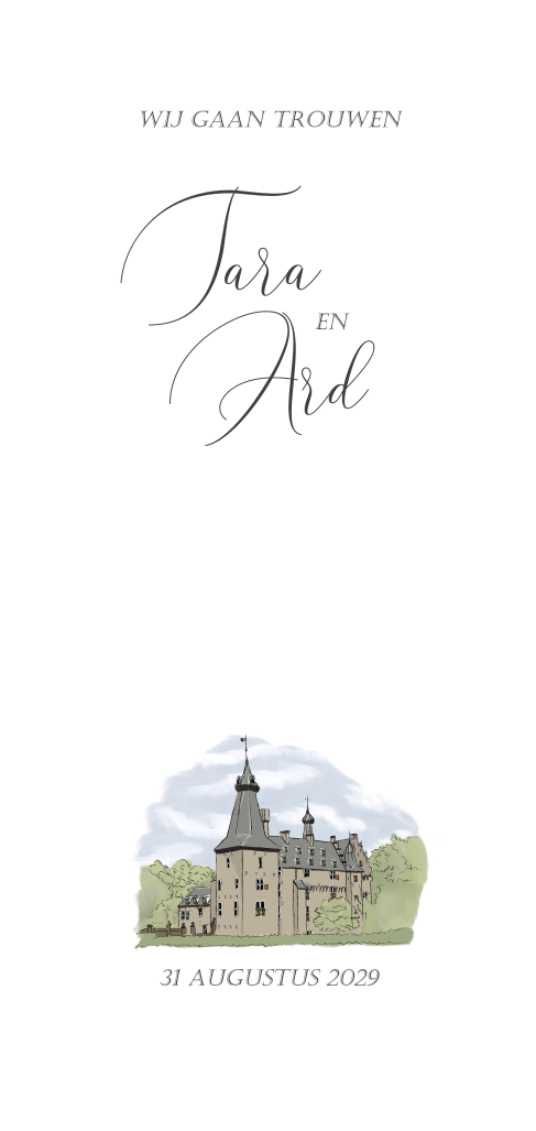 Verstuur een klassieke trouwkaart in langwerpige vorm. Op deze kaart staat een illustratie van een trouwlocatie. In de editor kan je deze aanpassen, we hebben illustraties van verschillende trouwlocaties. De illustraties zijn er in het zwartwit en kleur. Zo verstuur je altijd een originele en persoonlijke trouwkaart.