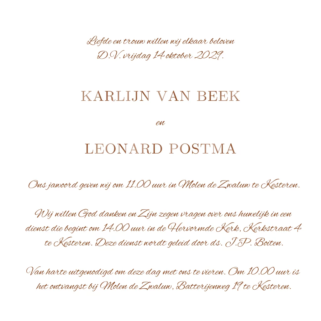 De tekst op de voorkant wordt met hoogglans gedrukt. Dit geeft een mooie glimmende laag. Ook jullie namen aan de binnenzijde wordt met hoogglans gedrukt. Zo maak je een klassieke trouwkaart met gevoel voor stijl. Daarna bestel je een proefdruk.