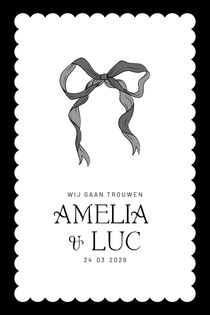 Ontwerp een moderne trouwkaart bruiloft voor jullie trouwdag. Dit is een staande trouwkaart met strik. Voeg zelf teksten toe op de achterkant.| Totaalprijs: 0 |