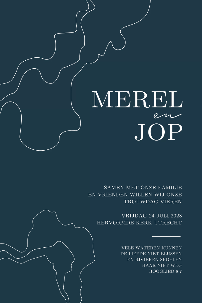Een stijlvolle, moderne trouwkaart in diepblauw. De teksten en illustraties worden in roséfolie gedrukt, wat zorgt voor een originele look.Totaalprijs: 0 |