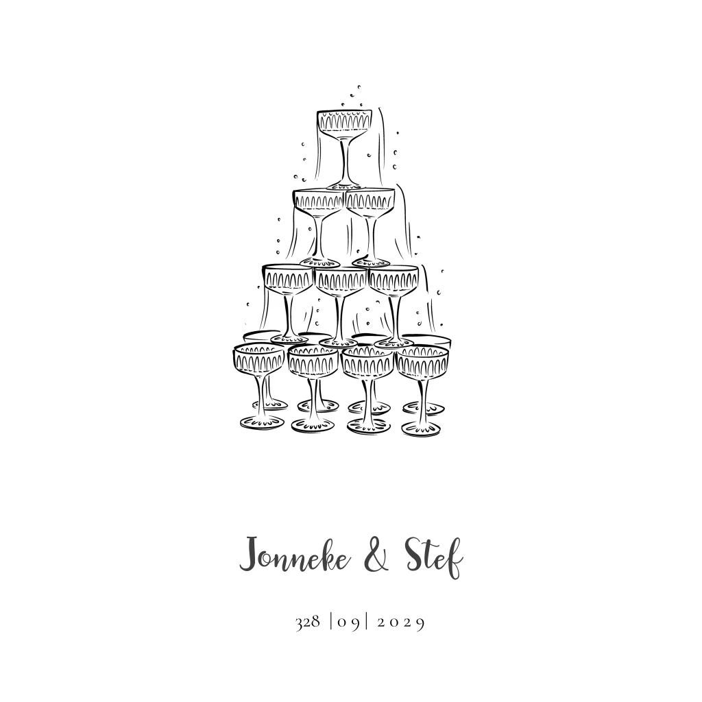 De champagnetoren is een leuke afbeelding om op je trouwkaart te plaatsen. Liever andere kleuren? Alles kan aangepast worden zodat deze past bij de stijl van jullie bruiloft.