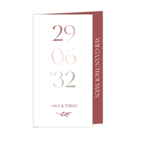 Ontwerp zelf een trouwkaart mapje om familie en vrienden uit te nodigen voor jullie trouwdag. Dit is een moderne trouwkaart met de datum in kleurtjes. Liever andere kleurtinten? Je kan zelf de kleuren aanpassen naar wens. Dit doe je eenvoudig in de editor. Maak op de achterkant van de kaart een logo van jullie initialen.