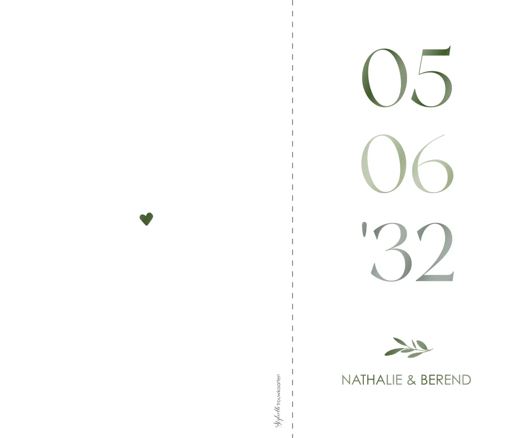 Ontwerp een klassieke trouwkaart in groene tinten met een grote datum op de voorkant. Het voorste kaartje is wat korter dan de achterste. De teksten worden in groen hoogglans gedrukt, wat voor een glimmend laagje zorgt. Aan de binnenkant maak je met icoontjes het dagprogramma van jullie dag.