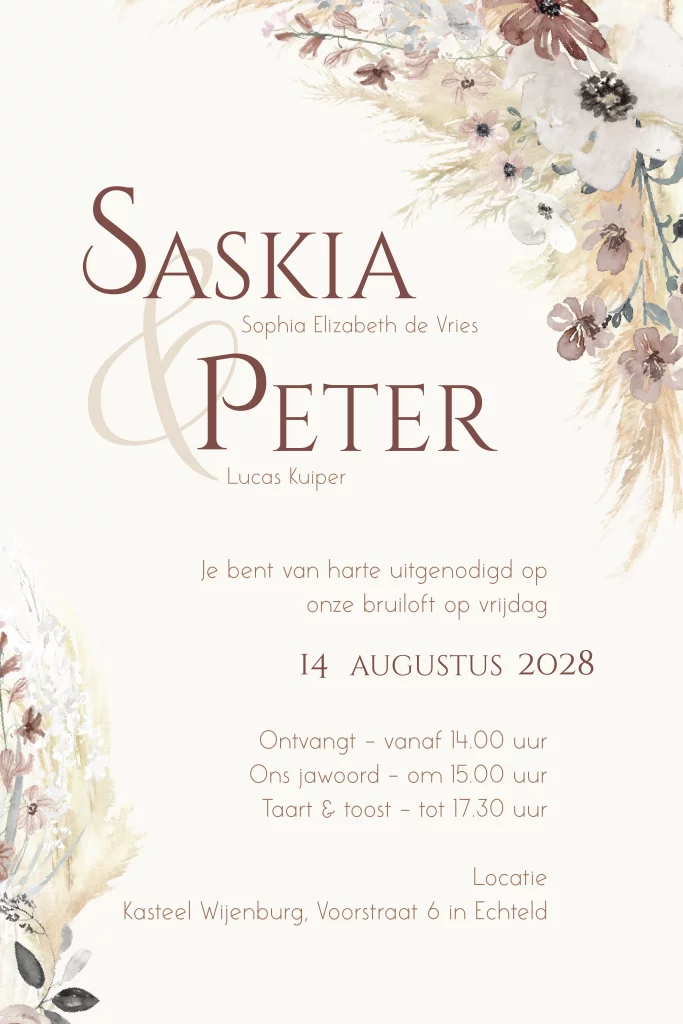 Maak een romantische trouwkaart met bohemian trouwkaart. Dit is een dubbele trouwkaart, zo is er genoeg ruimte voor alle informatie.