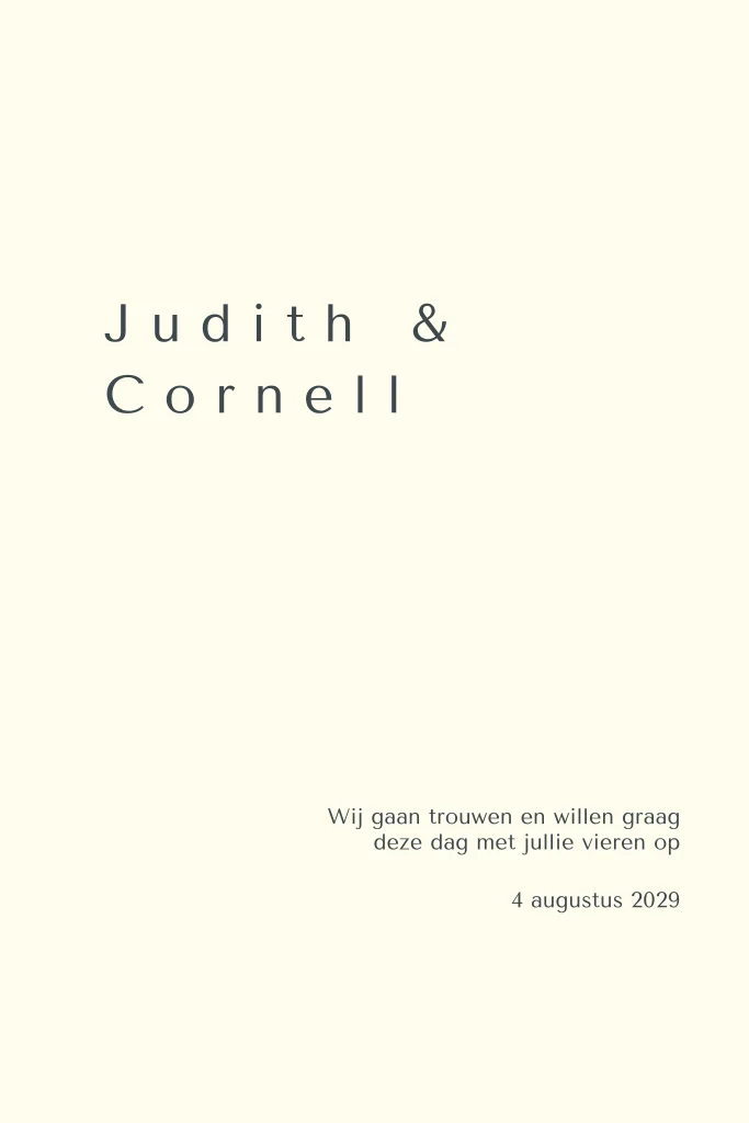 Bestel een simpele trouwkaart voor jullie bruiloft. Pas in de editor eenvoudig jullie namen en de tekst aan. Zo verstuur je een minimalistische trouwkaart.| Totaalprijs: 0 |