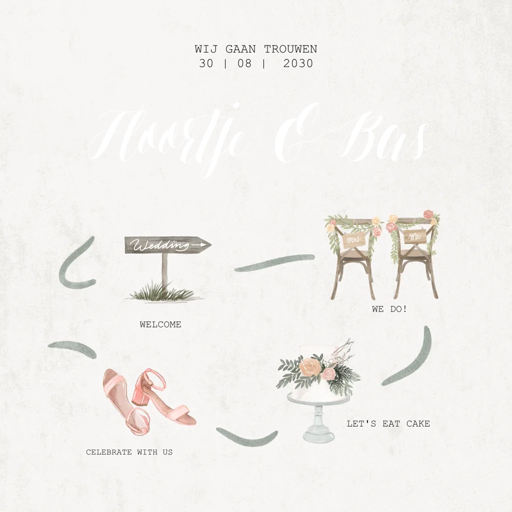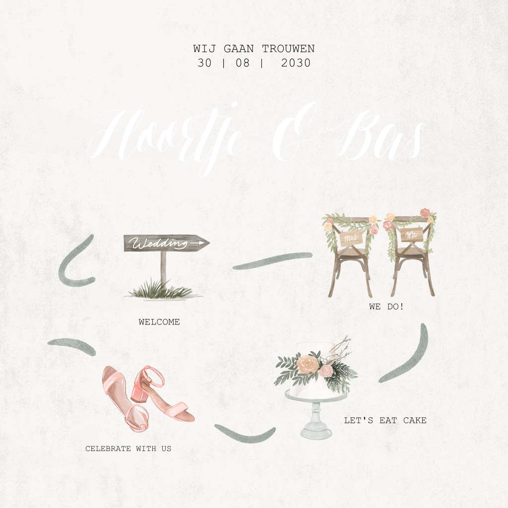 Maak een trouwkaart met een tijdlijn. Gebruik hiervoor onze unieke icoontjes. Meer icoontjes en tussenstukjes voor het "weggetje" vind je in de beeldbank