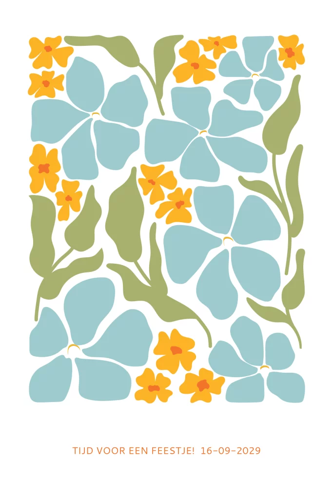 Ontwerp een trend trouwkaart met illustratie van bloemen. Dit zijn bloemen in blauwe tinten. Jullie namen worden in goudfolie gedrukt.