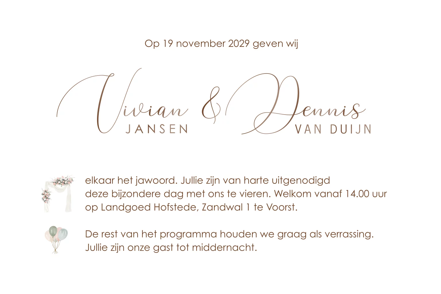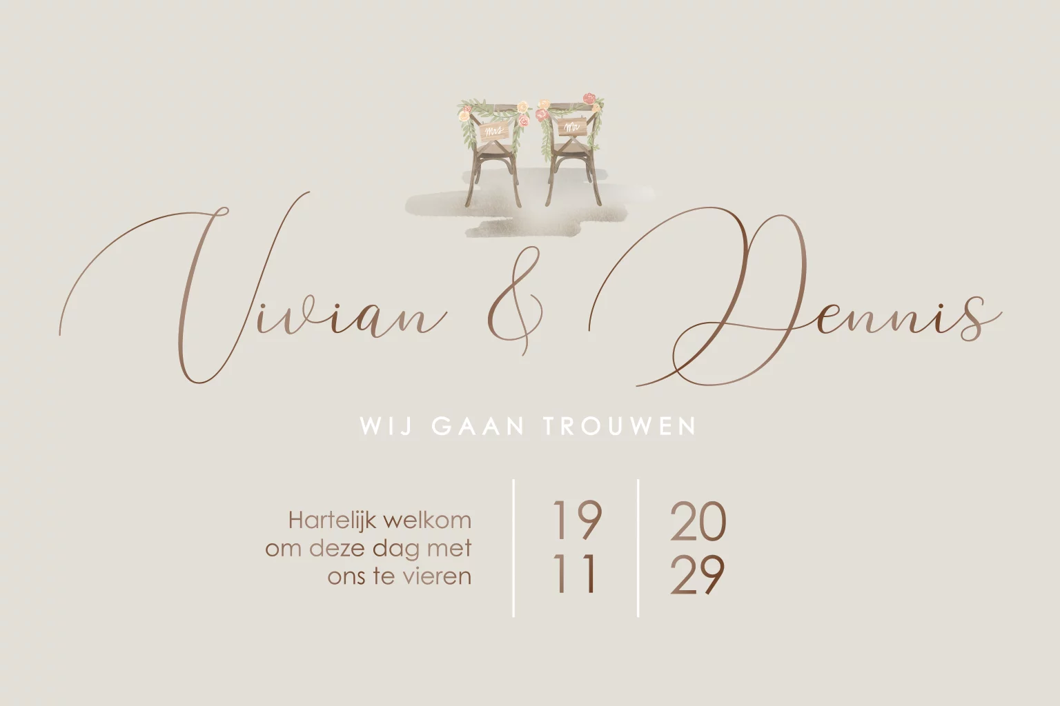 Ontwerp een liggende trouwkaart in klassieke stijl. De teksten worden in taupe hoogglans gedrukt. In de editor pas je eenvoudig de teksten en icoontjes aan.