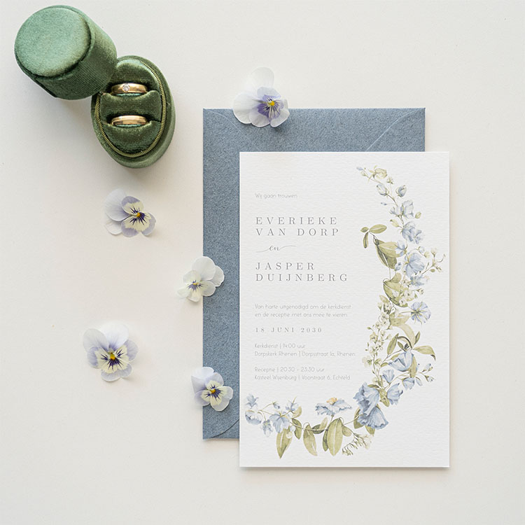 Bestel een vintage trouwkaart voor jullie grote dag. Dit is een staande trouwkaart met bloemen in lichtblauwe tinten. In de editor pas je eenvoudig alle teksten. Zo maak je een trouwkaart die helemaal bij jou past.