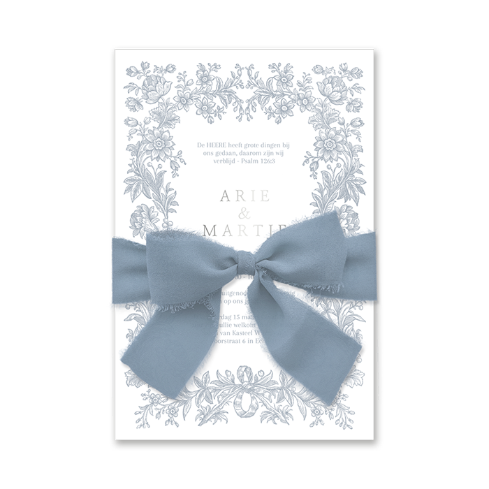 Ontwerp een vintage trouwkaart met bloemenkrans. Jullie namen worden in zilverfolie gedrukt, wat zorgt voor een chique look. Strik een blauw lint om de kaart om deze trouwkaart helemaal af te maken. Het blauwe lint bestel hier je los bij de trouwkaart.