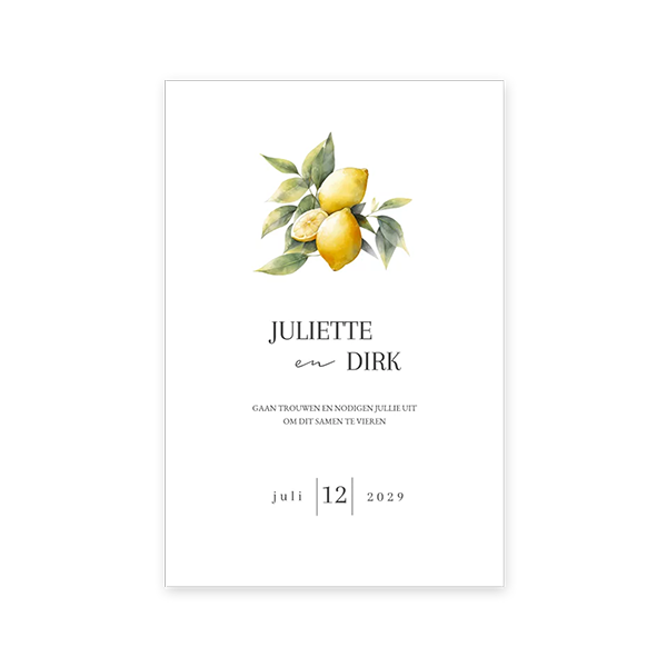 Dit is een stijlvolle trouwuitnodiging met illustratie van citroentjes. Verstuur deze zomerse trouwkaart naar de daggasten of avondgasten van jullie bruiloft.