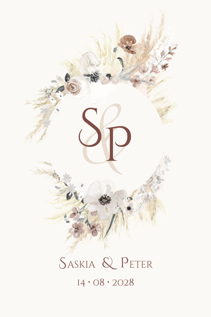 Met deze droogbloemen en logo maak je stijlvolle trouwkaartjes. Een logo maak je eenvoudig met jullie eigen initialen in 2 tekstvakken. Deze kaart is te bestellen in verschillende formaten, maar we adviseren 11 bij 17 cm. Je kunt ook bijpassende kaartjes voor extra informatie op de site vinden.