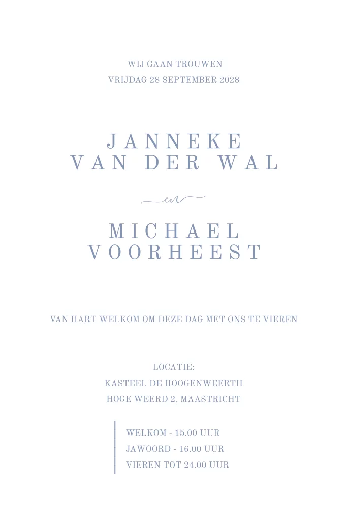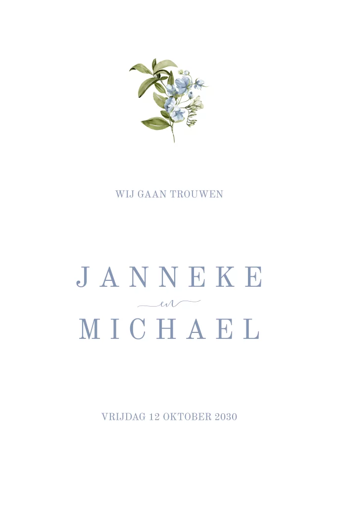 Maak een romantische trouwuitnodiging voor jullie trouwdag. Dit is een staande trouwkaart in blauwe tinten met bloemen. De kaart is dubbel, daardoor is er genoeg ruimte voor alle informatie over jullie bruiloft.