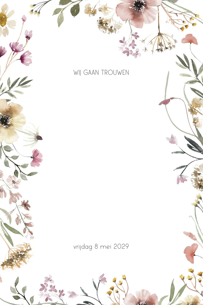 Ontwerp een romantische trouwkaart voor jullie bruiloft. Dit is een bloemen trouwkaart met teksten in goudfolie. Op de achterkant plaats je informatie over jullie trouwdag.