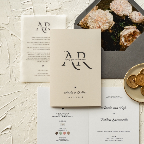 Ontwerp een klassieke trouwuitnodiging in beige met logo. Dit is een dubbele kaart, waardoor je genoeg ruimte hebt om alle informatie kwijt te kunnen.