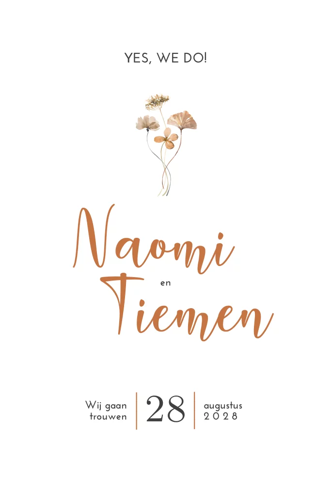 Deze stijlvolle Trouwkaart met koperfolie maakt deel uit van een Bestel een stijlvolle trouwuitnodiging voor jullie bruiloft. Dit is een staande trouwkaart met bloemetjes. Op de achterkant staan icoontjes en een logo van jullie initialen. Liever andere bloemetjes? Dit pas je gemakkelijk aan in de editor.