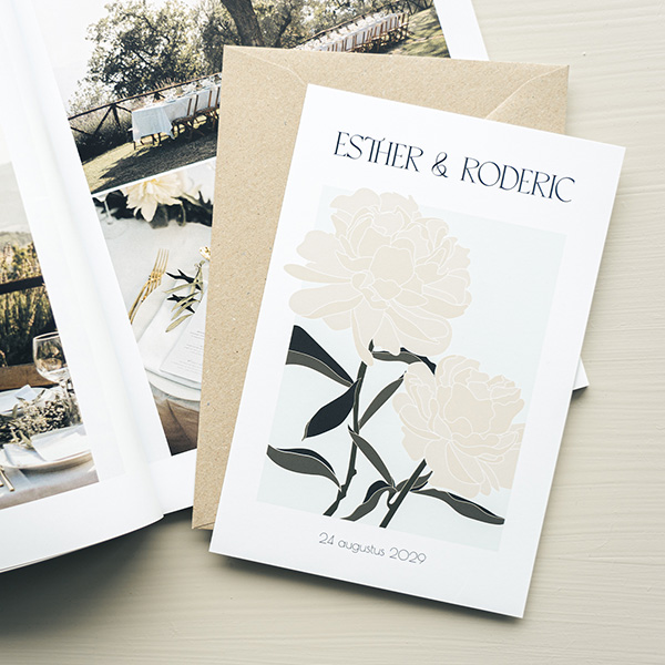 Bestel een trend trouwuitnodiging voor jullie bruiloft. Dit is een originele trouwuitnodiging met illustratie van graphic bloemen. In de editor pas je eenvoudig de teksten aan.