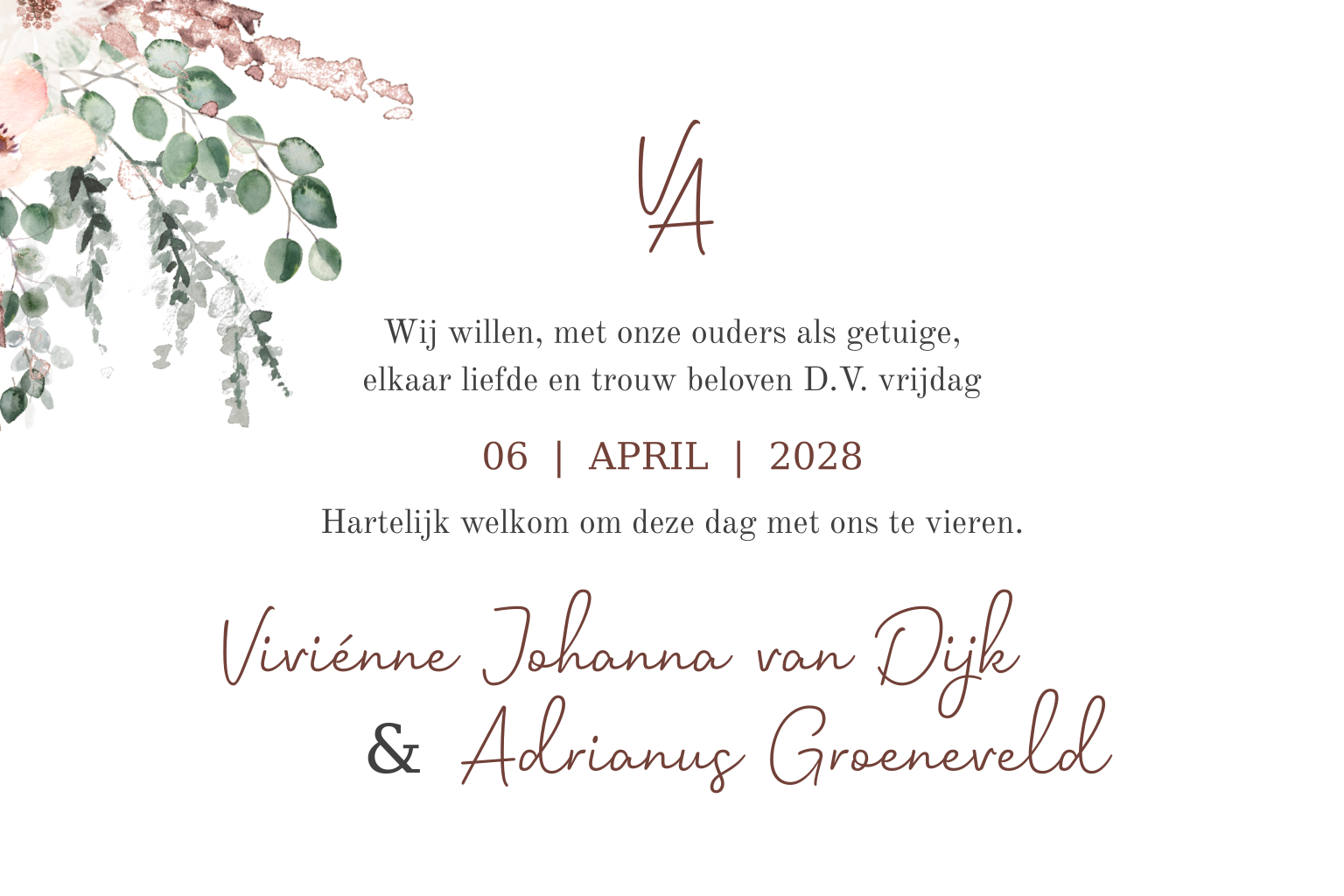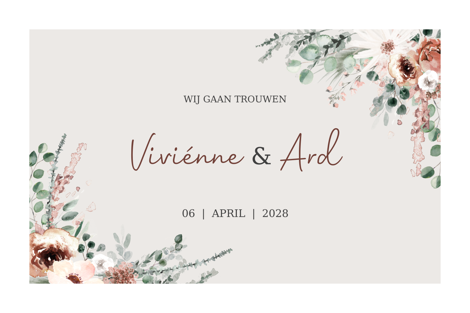 Een bruiloft uitnodiging met bloemen in bohemian sfeer. Pas de teksten aan voor jullie bruiloft. Te bestellen in verschillende formaten en op verschillende papiersoorten.