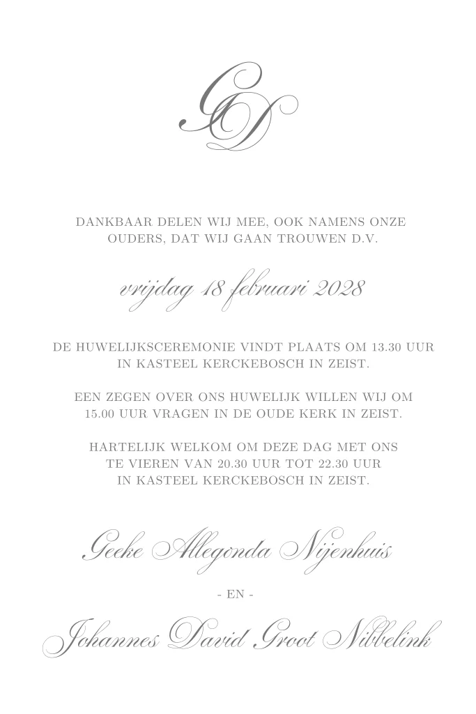 Trouwen jullie in Kasteel Kerckebosch? Dan is dit een passende klassieke trouwkaart. Laat de afbeelding van deze prachtige trouwlocatie terugkomen op al jullie drukwerk. Trouwen jullie in een ander kasteel? Kijk dan in de kaartopmaker in de map KASTELEN of jullie locatie er bij staat. Je kunt de afbeelding op deze kaart verwijderen en de juist trouwlocatie plaatsen in de kaart. Staat jullie trouwlocatie er niet bij? Neem dan contact met ons op voor de mogelijkheden.
