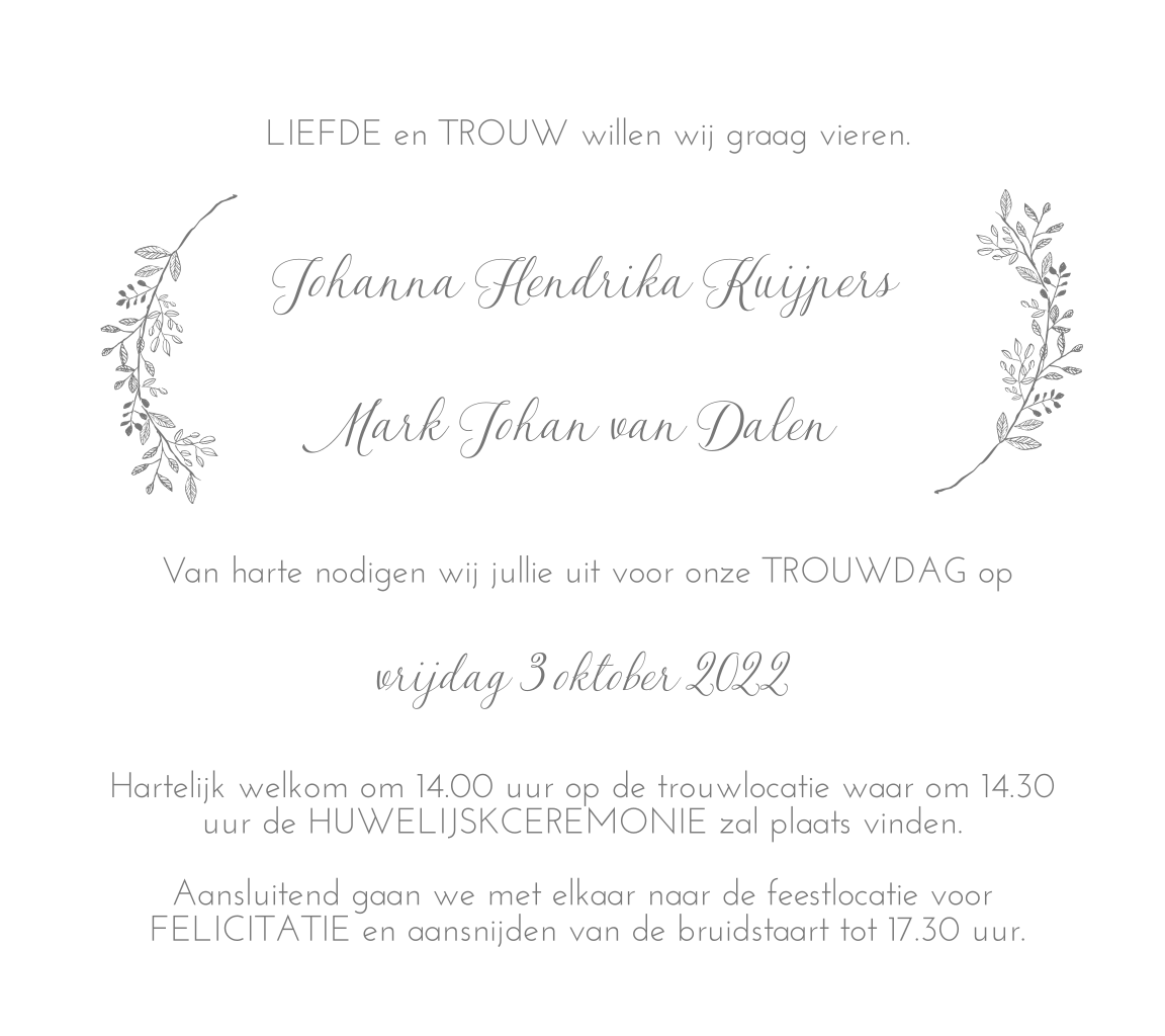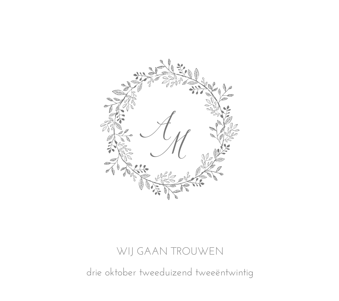 Een stijlvolle trouwkaart met kransje waarvan eventueel de kleur aangepast kan worden. Alle onderdelen in de trouwkaart kunnen worden verschoven en van kleur worden veranderd. Maak een unieke trouwkaart van dit klassieke ontwerp en bestel een proefdruk.