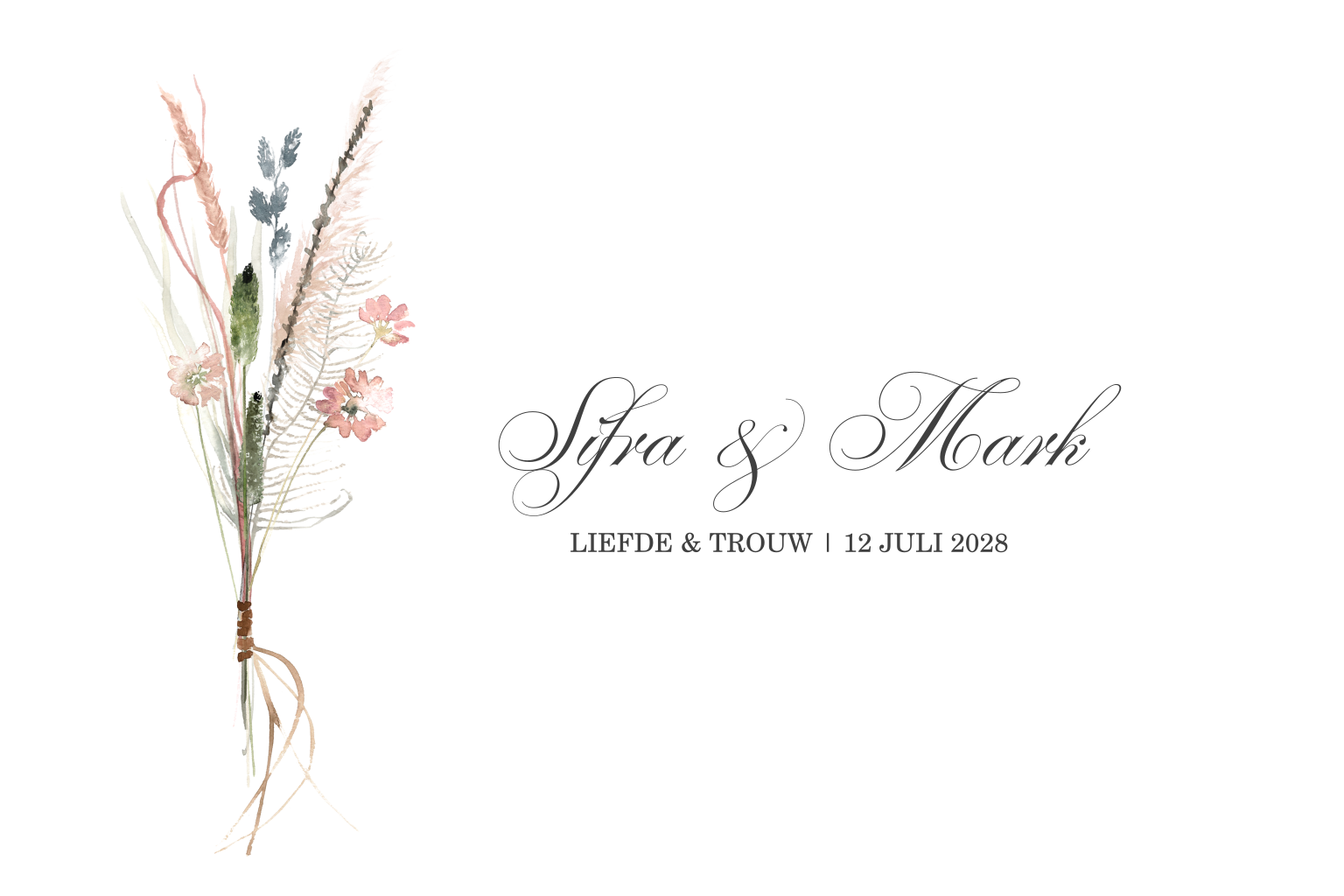 Een klassieke trouwkaart met lief boeketje van droogbloemen. Zo maak je een mooie combinatie van trend en klassiek. Kies voor deze kaart als hij past bij de stijl van jullie bruiloft.