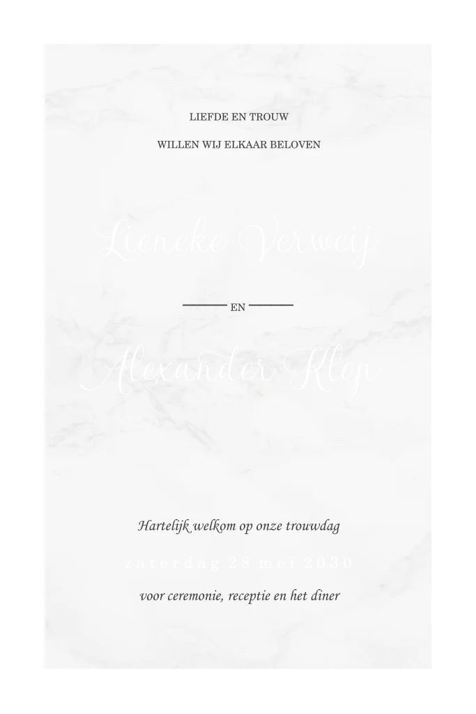 Een klassieke trouwkaart met jullie namen in goudfolie met een lichte marmerlook op de achtergrond. Deze trouwkaart klassiek kun je helemaal aanpassen naar jullie smaak.