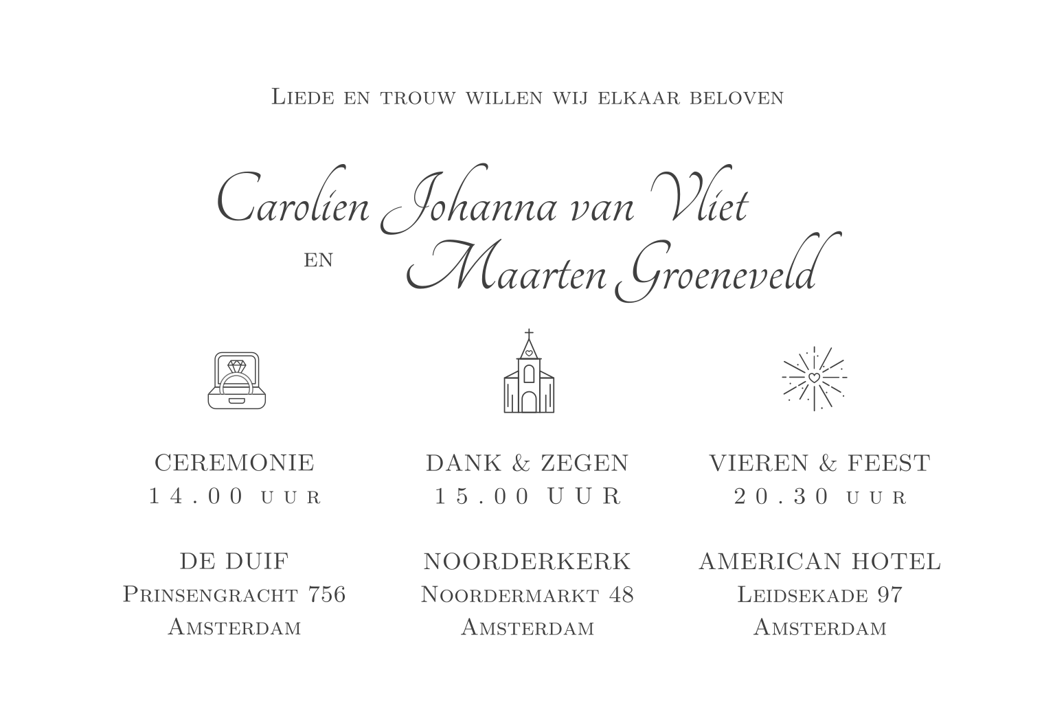 Stijlvol en chic is deze trouwkaart voor jullie bruiloft. Eenvoud kan zo mooi zijn. De binnenkant is een verrassing. Hou je niet van icoontjes? Deze zijn te verwijderen. Wil je een andere opmaak van de tekst? Neem dan contact met ons op.