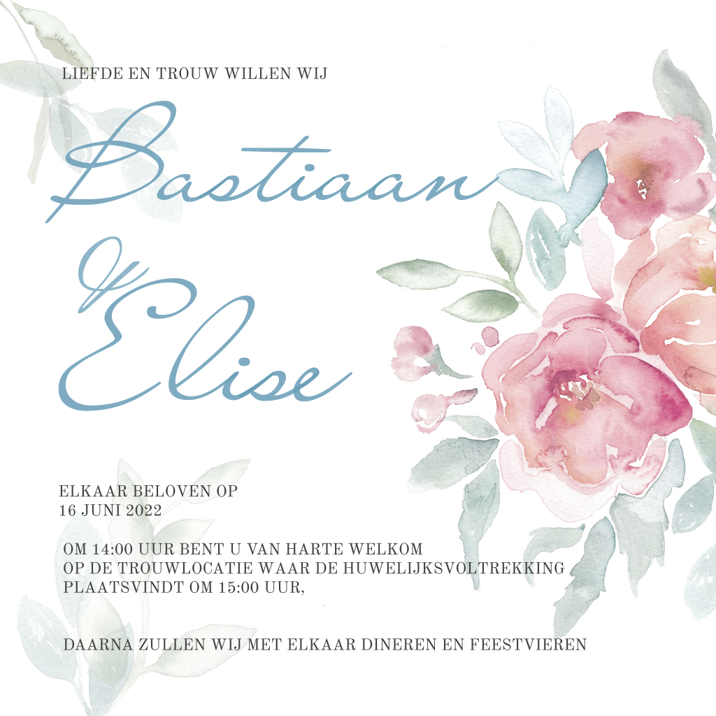 Deze romantische trouwkaart heeft een bijzonder ontwerp. De rozen zijn handgemaakt met waterverf. Dit geeft het ontwerp een zachte uitstraling. Wil je de elementen op een andere plek dan kan je ze verplaatsen. Ze kunnen niet van kleur veranderen.
