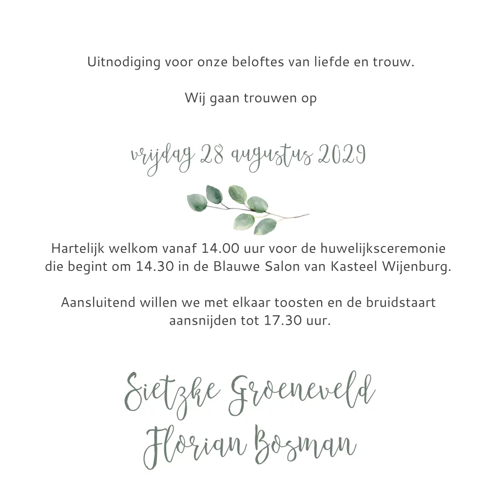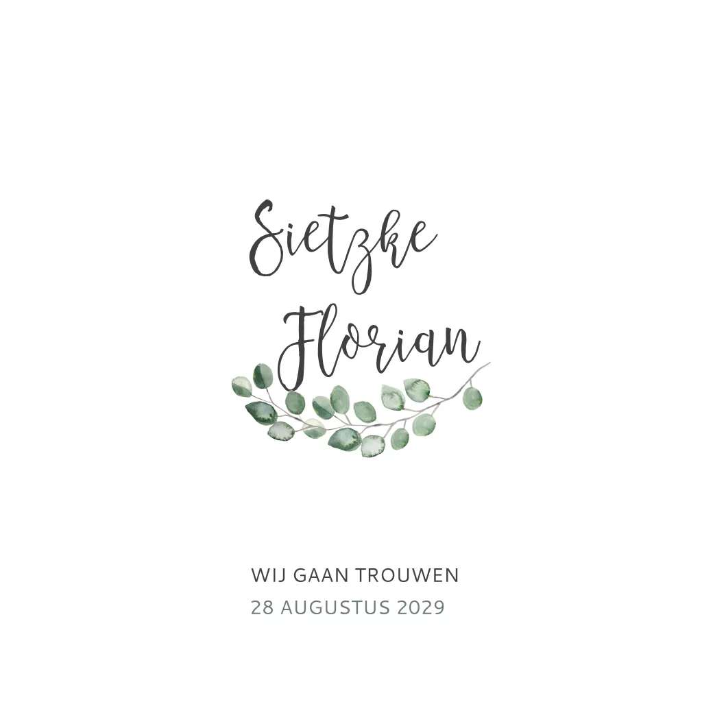 Deze klassieke trouwkaart heeft een trendy look door het met de hand geverfde eucalyptus takje en de originele opmaak aan de binnenkant. Maak in de kaartopmaker een trouwkaart met jullie eigen programma en icoontjes. In de clipart staan veel verschillende icoontjes om uit te kiezen.