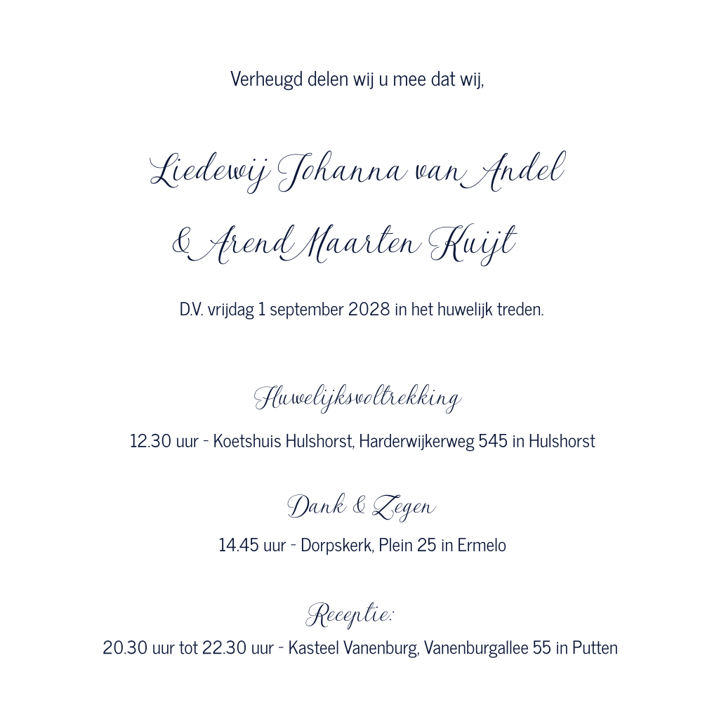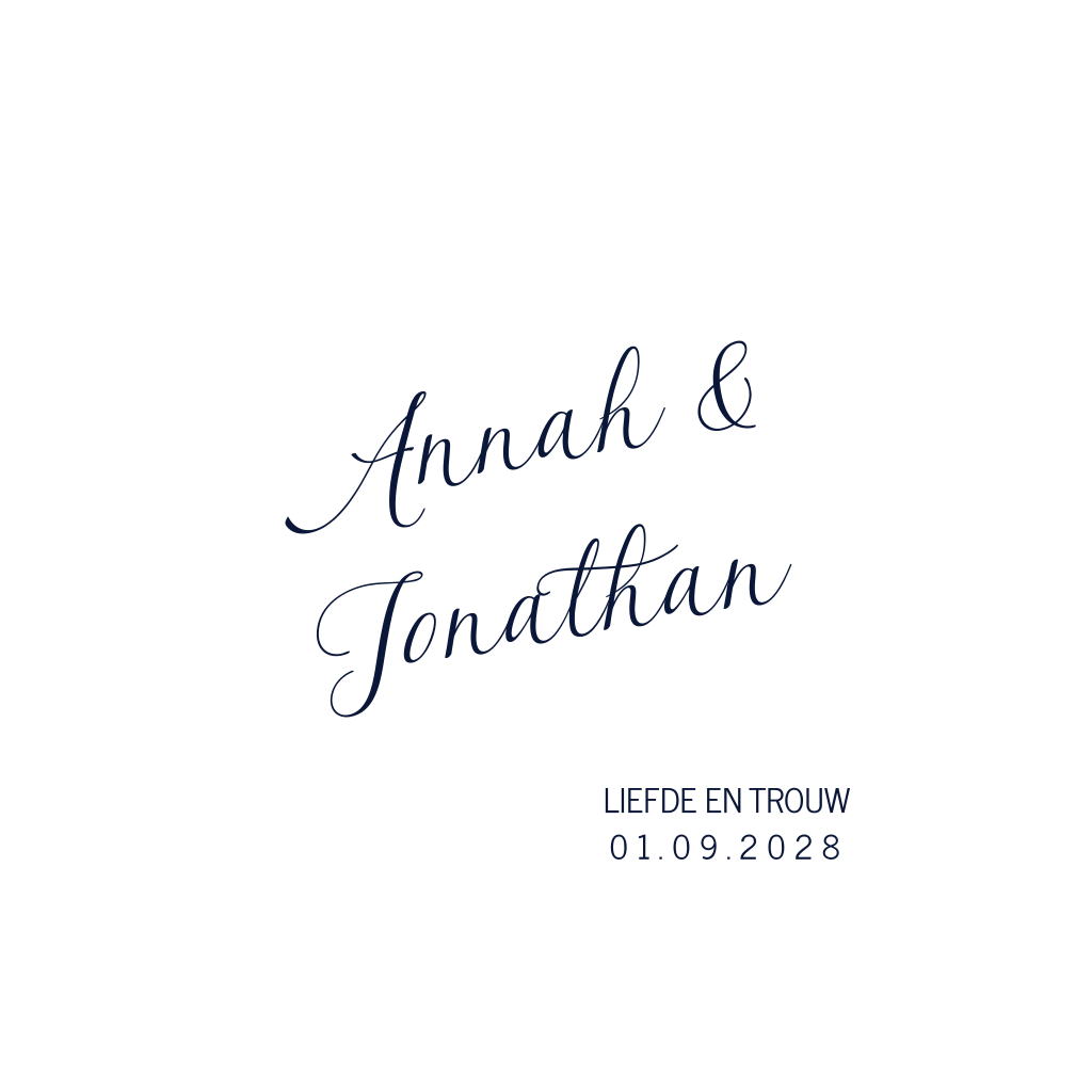 Deze klassieke trouwkaart is eenvoudig gehouden aan de voorkant door het enkel weergeven van de namen en de datum. Dit zorgt dat op het eerst belangrijke de aandacht gelegd wordt. Deze huwelijksuitnodiging heeft een diep donker blauwe kleur. Kies de kleur die jullie mooi vinden.