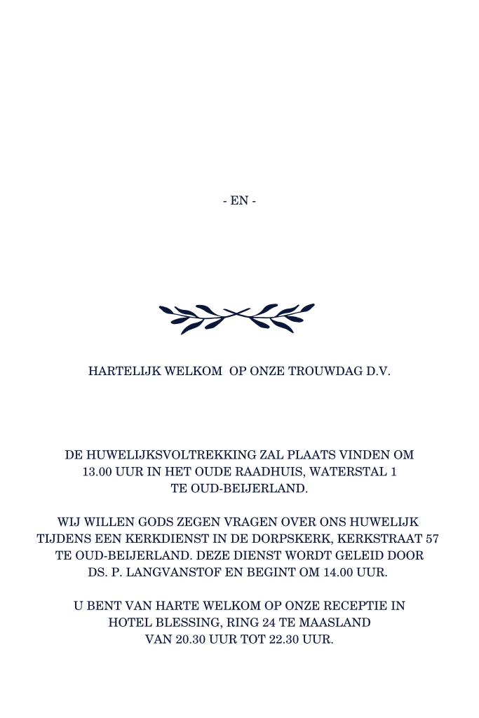 Een klassieke trouwuitnodiging met goudfolie en takje. Op alle zijden wordt folie gedrukt. Je kunt in de kaartopmaker de teksten aanpassen. Maak ook een achterkant van deze trouwuitnodiging een mooi logo en laat deze terugkomen in alle drukwerk voor de bruiloft.