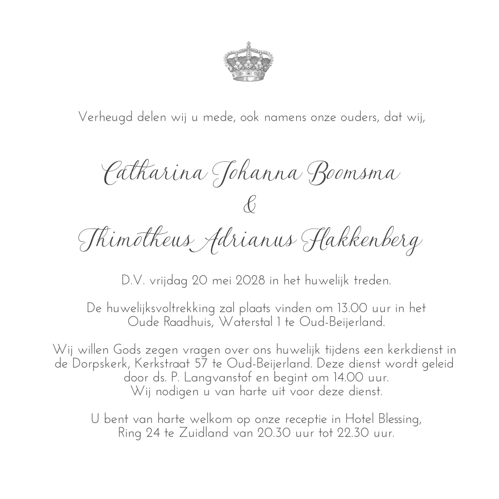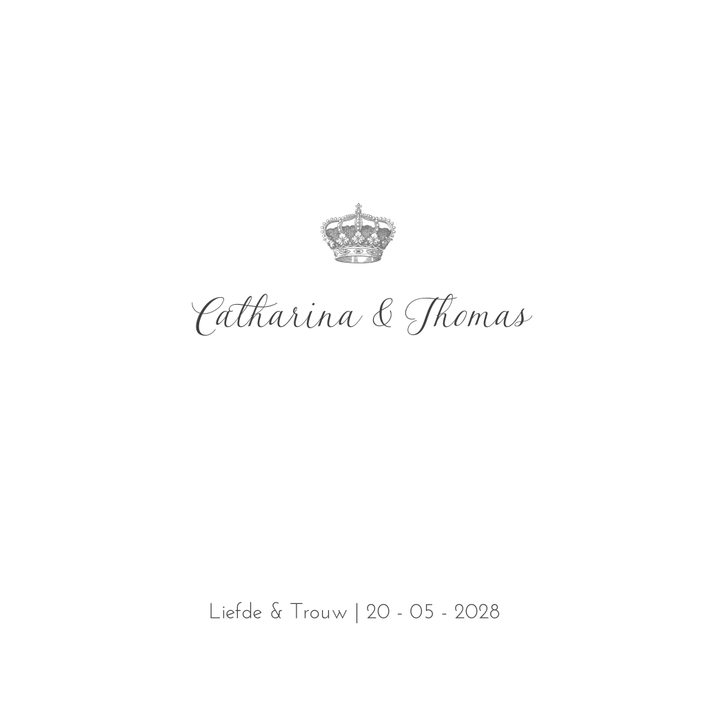 Een zeer chique en stijlvolle trouwkaart met enkel een kroontje op de voorzijde. Schrijf aan de binnenkant van de kaart een persoonlijke tekst voor de gasten en vertel ze waarom je deze dag graag met hun wil delen.