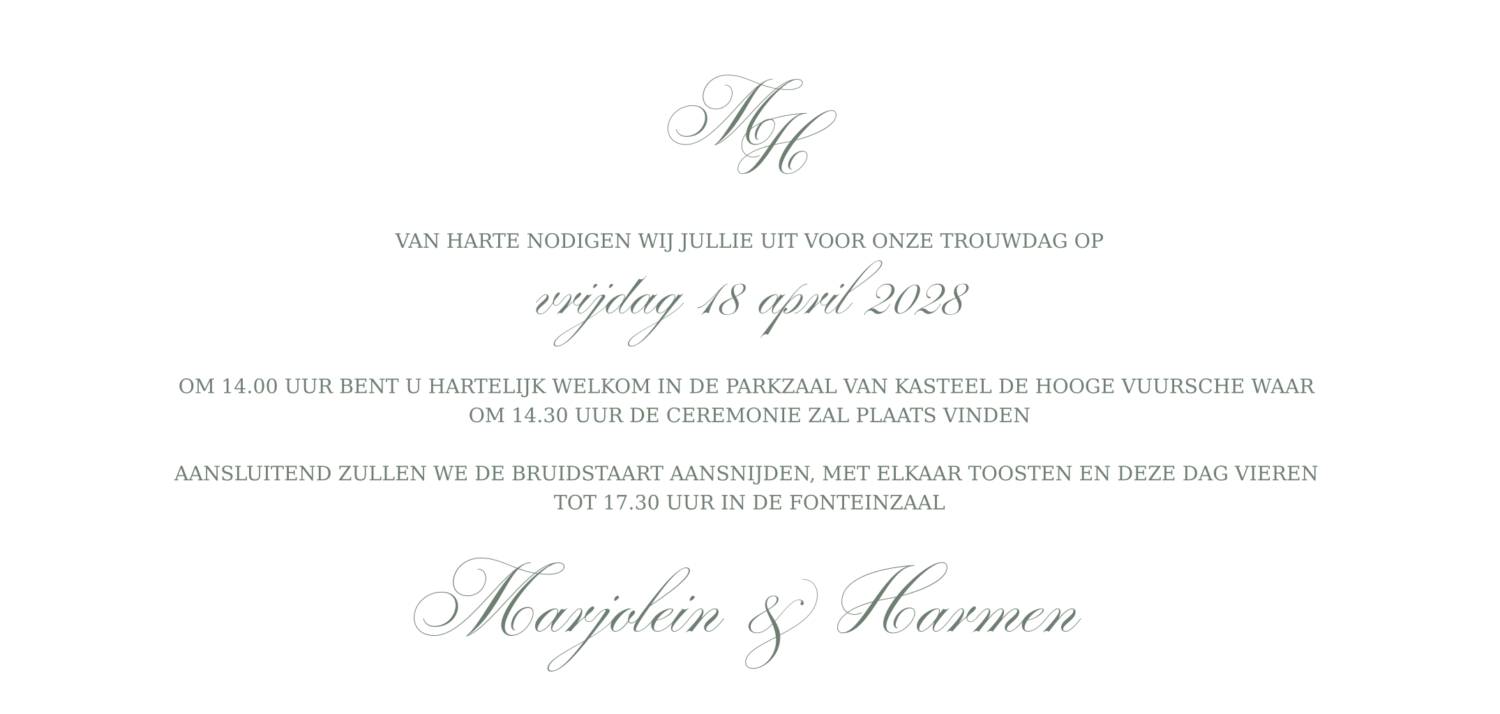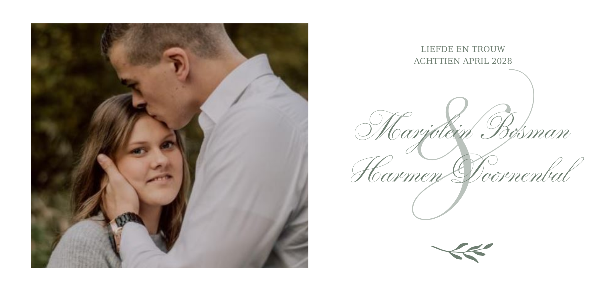 Plaats jullie eigen foto op deze klassieke trouwkaart. Wij hebben de groene kleur uit de foto terug laten komen in de tekstkleur. Kies ook een kleur die matcht met jullie foto. Hulp nodig met het kiezen van een kleur? Neem contact met ons op.