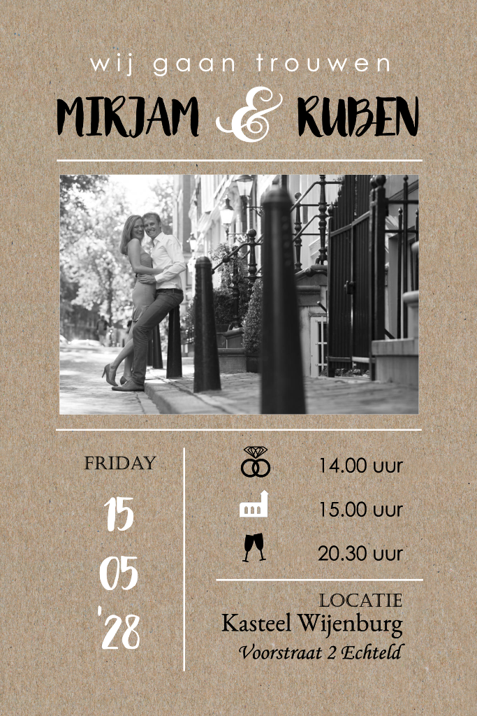 Deze kraft trouwkaart heeft leuke icoontjes. Voor jullie eigen programma kun je veel verschillende icoontjes vinden in de beeldbank. Jullie maken deze huwelijksuitnodiging bijzonder door een foto toe te voegen.