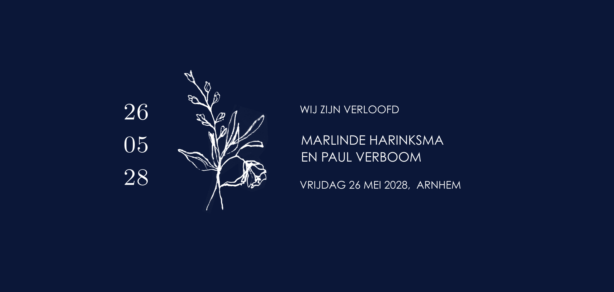 Strak en modern is deze verlovingskaart. In de kaartopmaker kun je een eigen ontwerp maken met dit voorbeeld.