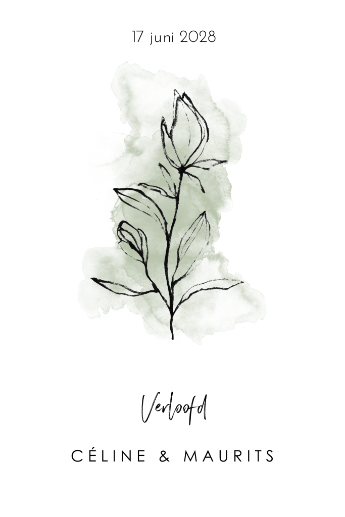 Verstuur deze verlovingskaart met unieke takje om jullie verloving aan te kondigen. De groene kleur kan in de kaartopmaker aangepast worden naar elke andere tint.