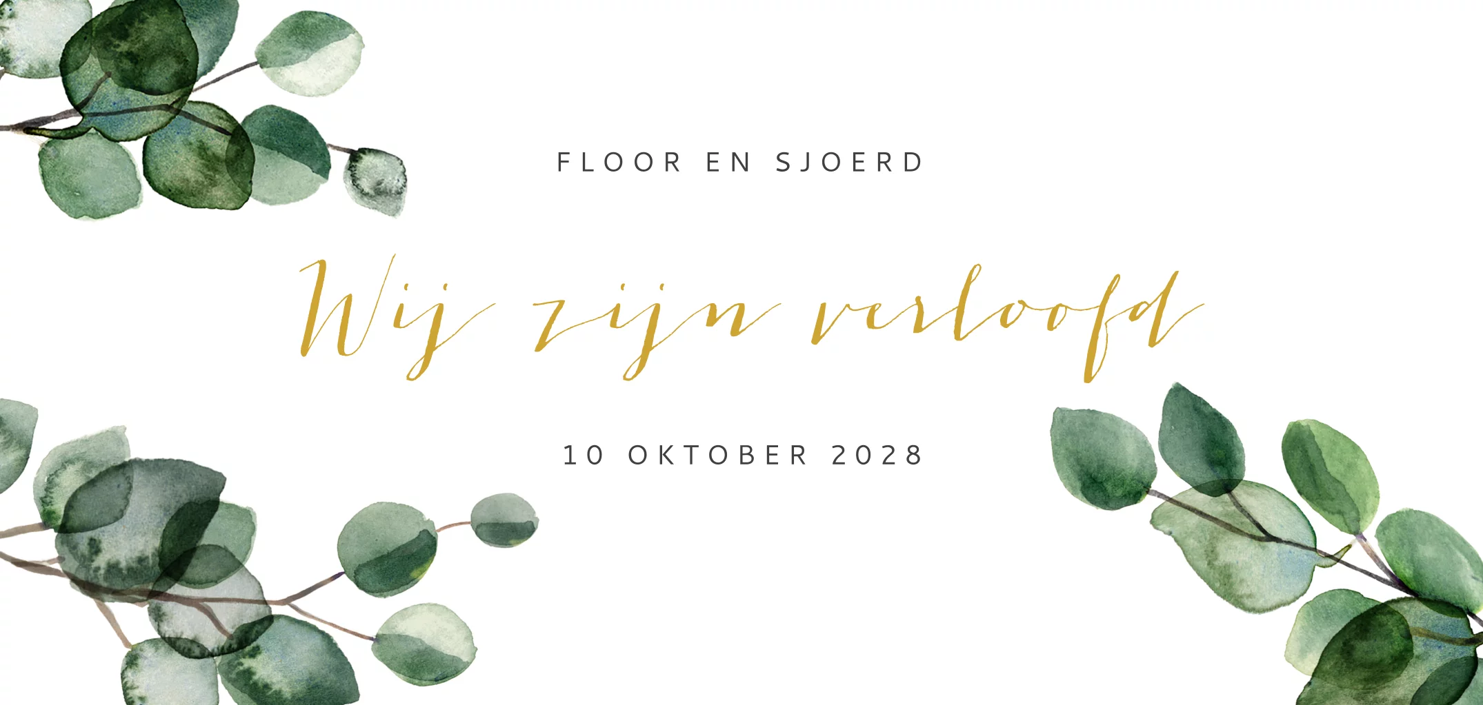 Nodig jullie familie en vrienden uit voor een verlovingsfeestje met deze verlovingskaart. Het formaat van deze kaart is 21 bij 10 cm. Je kunt tijdens het bestellen kiezen uit meerdere papiersoorten. Klik nu op BEWERK DEZE KAART om in de kaartopmaker de teksten aan te passen. We hebben in de beeldbank ook een map met nog meer eucalyptus blaadjes. Zo maak je altijd een unieke verlovingskaart!