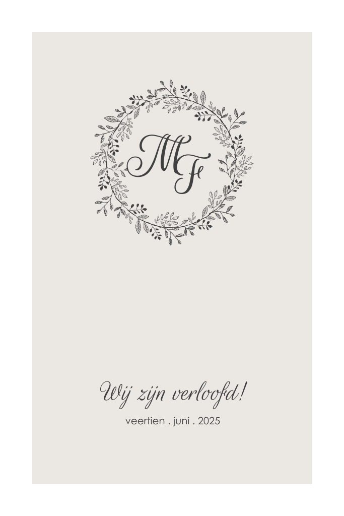 Een klassieke enkele verlovingskaart met kransje van bloemen. Op de voorkant kunnen jullie je eigen logo maken met de eerste letter van jullie namen. Op de achterkant kan een foto worden geüpload om een uniek ontwerp te maken.