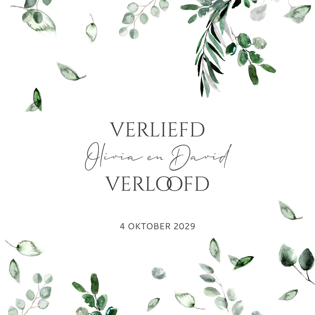 Bestel een botanische verlovingskaart in vierkante vorm en eucalyptusblaadjes. Je kunt bijpassende ontwerpen vinden op de site.| Totaalprijs: 0 |