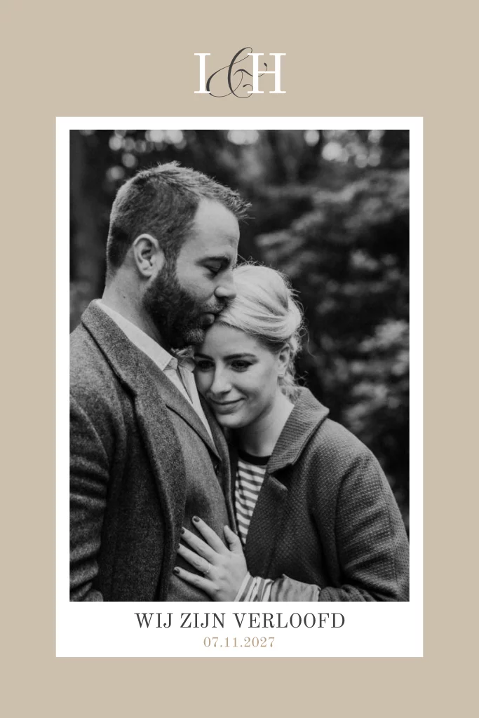 Ontwerp een klassieke verlovingskaart met een foto en jullie logo. In de editor upload je gemakkelijk een persoonlijke foto.