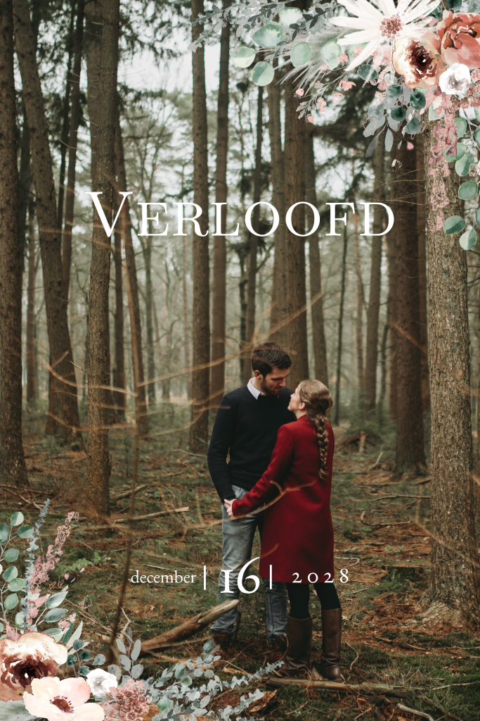 Een Bohemian verlovingskaart met goudfolie en foto op de voorkant. Deze kaart past bij de trouwhuisstijl Bohemian Gold. De foto op de voorkant kun je aanpassen naar een foto van jullie zelf.