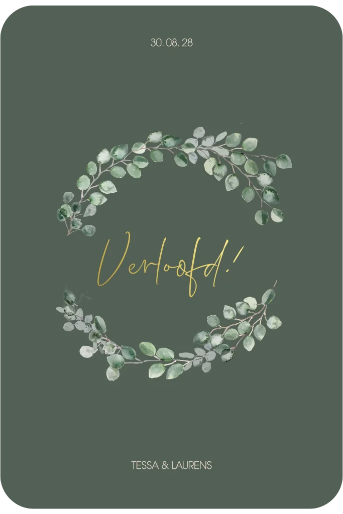 Verstuur een stijlvolle verlovingskaart met een krans van blaadjes. Op deze kaart wordt goudfolie gedrukt.