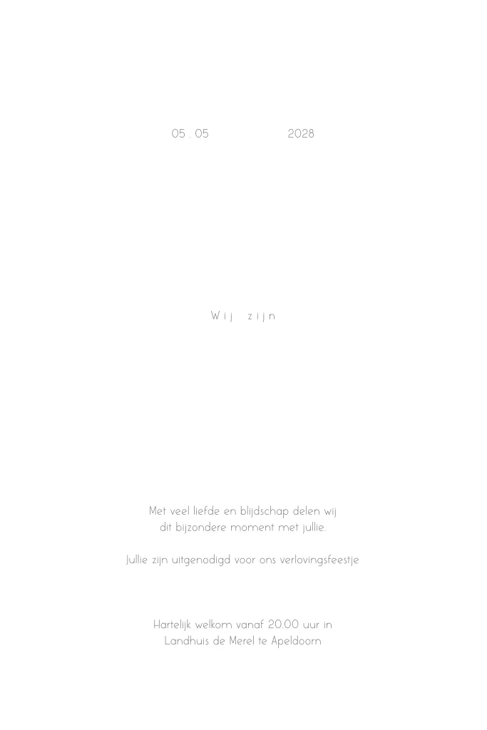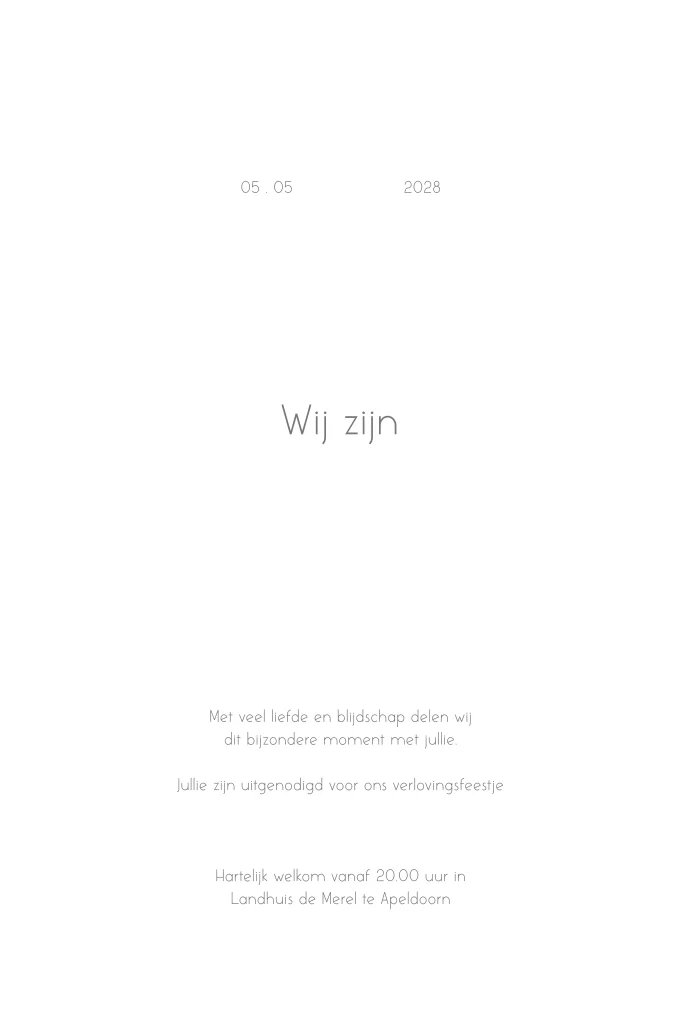 Bestel een klassieke verlovingskaart om mensen te laten weten dat jullie verloofd zijn. Sommige tekst op deze verlovingskaart wordt in goudfolie gedrukt. liever een andere kleur folie? Dat pas je eenvoudig aan in de editor.| Totaalprijs: 0 |