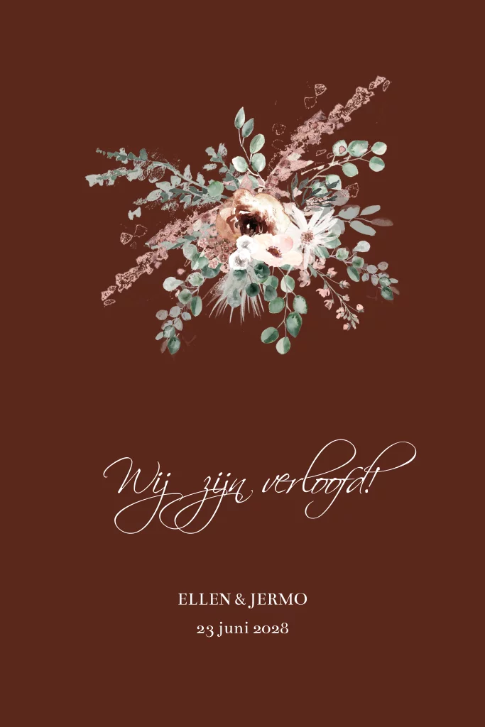 Ontwerp een romantische verlovingskaart met bloemen en blaadjes. In de editor kan je de teksten eenvoudig personaliseren.